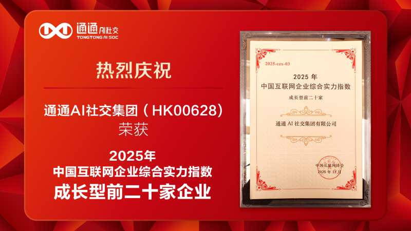 12月29日,中国互联网协会在北京举办《中国互联网企业综合实力指数(2025)》发布会,并揭晓了2025年中国互联网综合实力前百家企业、成长型前二十家企业及网络安全企业三大权威榜单。其中,通通AI社交集团(股票代码:00628.HK)凭借多元业务稳健布局、创新能力与强劲的成长潜力,成功入选“2025年中国互联网成长型前二十家企业”,并荣登成长型企业前三强。